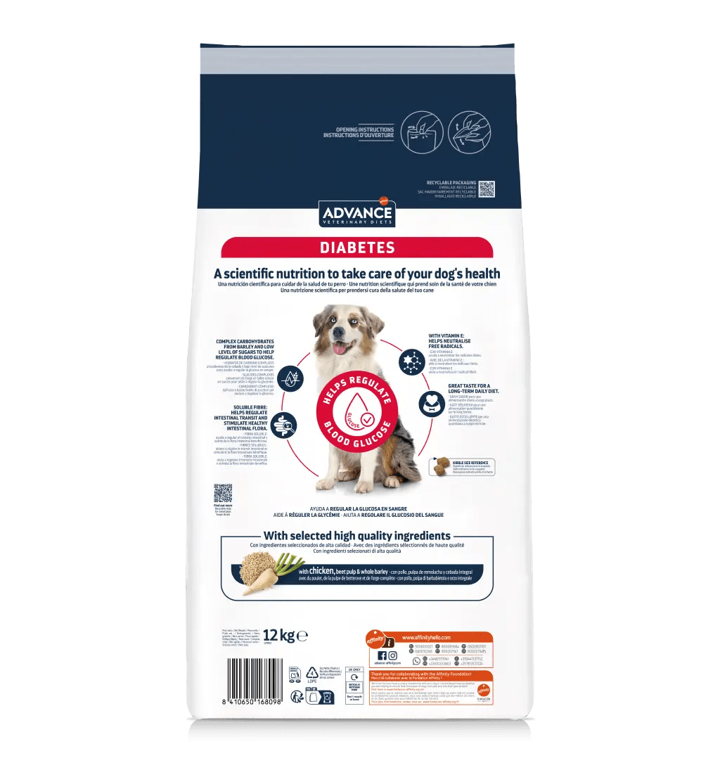 ADVANCE VETERINARY DIETS Diabetes es un alimento dietético completo para perros adultos formulado para controlar el aporte de glucosa (diabetes mellitus) y compensar la mala digestión. Proporcionando un nivel bajo de carbohidratos de liberación rápida de glucosa, ingredientes muy digestibles y un contenido bajo en grasa. Su alto contenido en fibras solubles facilita el tránsito intestinal y favorece una microbiota intestinal saludable. Además, su fórmula baja en calorías le ayuda a controla su peso y tiene un gran sabor lo que facilita la alimentación diaria en perros con diabetes o colitis.