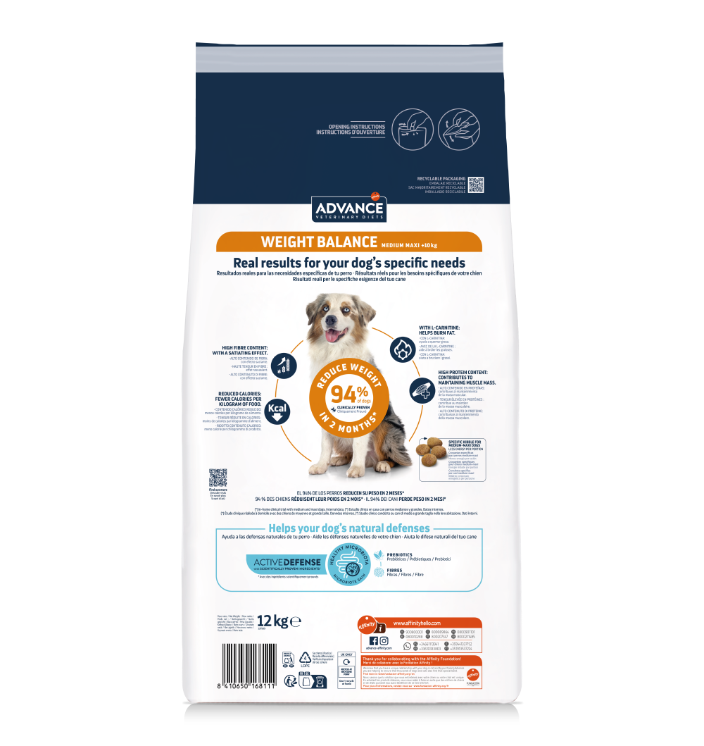 ADVANCE VETERINARY DIETS Weight Balance Medium/Maxi es un alimento dietético completo para perros adultos de tamaño medium/maxi formulado para reducir el exceso de peso y regular el metabolismo lipídico en caso de hiperlipidemia, con niveles bajos de energía, bajo contenido de grasa y alto contenido de ácidos grasos esenciales. Su fórmula además consigue provocar un cambio en la microbiota del perro aumentado su riqueza, volviéndola similar a la de perros en su peso ideal.