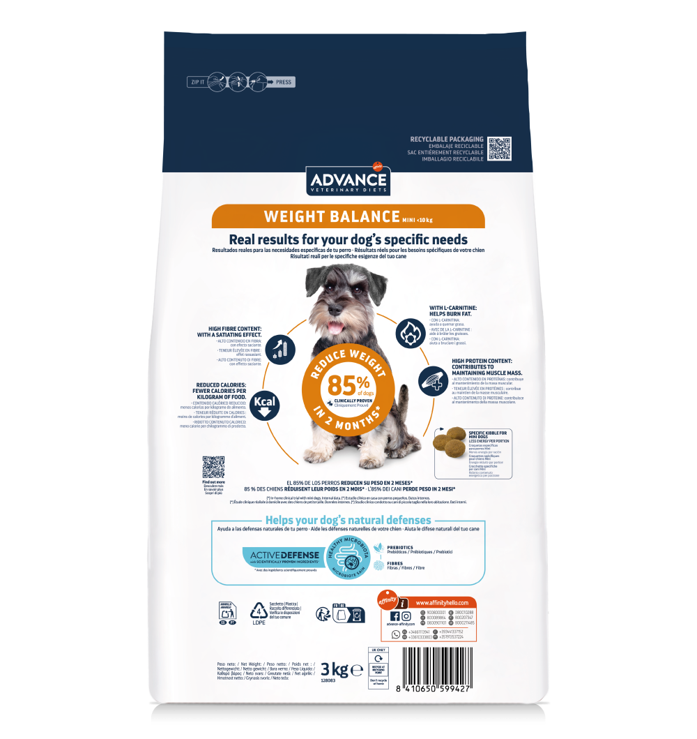 ADVANCE VETERINARY DIETS Weight Balance Mini es un alimento dietético completo para perros mini adultos formulado para reducir el exceso de peso y regular el metabolismo lipídico en caso de hiperlipidemia, con niveles bajos de energía, bajo contenido de grasa y alto contenido de ácidos grasos esenciales. Su fórmula además consigue provocar un cambio en la microbiota del perro aumentado su riqueza, volviéndola similar a la de perros en su peso ideal.